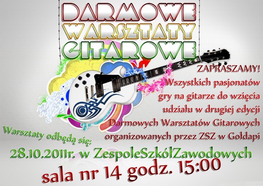 Zespół Szkół Zawodowych w Gołdapi organizuje bezpłatne warsztaty gitarowe. Wszyscy chętni do wzięcia w nich udziału powinni zgłosić się 28 października do sali nr 14 w ZSZ.
