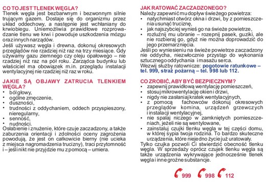 - nie bagatelizuj objawów duszności, bólów i zawrotów głowy, nudności, wymiotów, oszołomienia, osłabienia, przyspieszenia czynności serca i oddychania, gdyż mogą być sygnałem, że ulegasz zatruciu czadem; w takiej sytuacji należy natychmiast przewietrzyć pomieszczenie, w którym się znajdujemy i zasięgnąć porady lekarskiej.