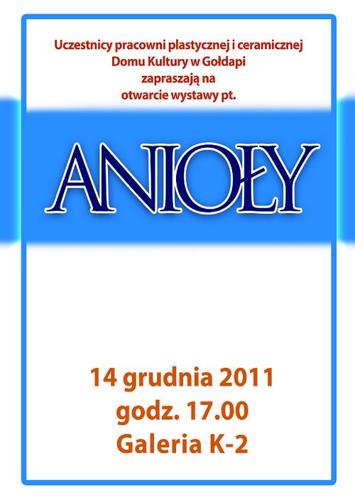 Uczestnicy pracowni plastycznej i ceramicznej Domu Kultury w Gołdapi zapraszają na otwarcie wystawy pt. „Anioły". Odbędzie się ono 14 grudnia o godzinie 17.00 w Galerii K2.