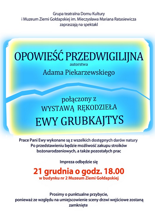 Grupa teatralna Domu Kultury i Muzeum Ziemi Gołdapskiej im. Mieczysława Mariana Ratasiewicza zapraszają na spektakl pt. „Opowieść przedwigilijna", połączony z wystawą rękodzieła Ewy Grubkajtys. Impreza odbędzie się 21 grudnia o godz. 18.00 w budynku nr 2 muzeum.