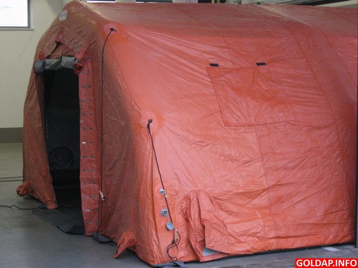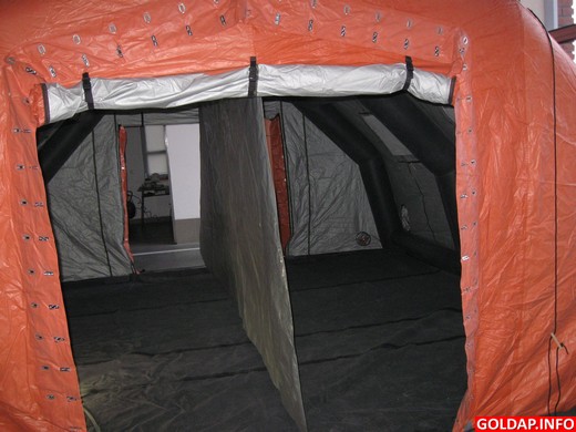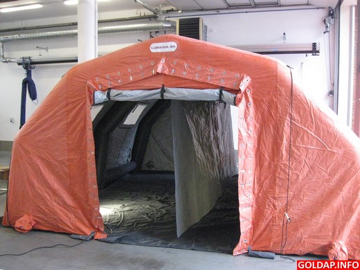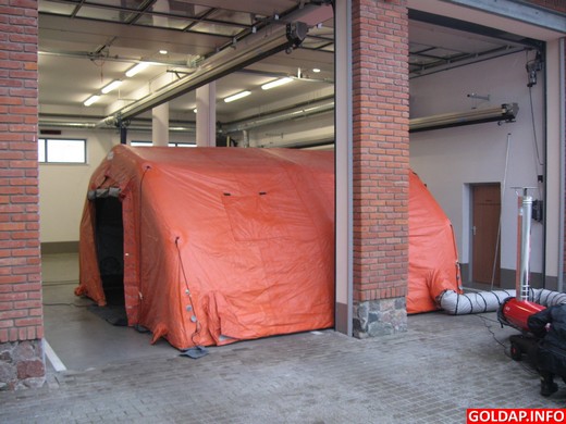 Nowy namiot będzie służył mieszkańcom powiatu gołdapskiego w sytuacjach kryzysowych. Sprzęt tego typu jest niezastąpiony w budowie szpitali polowych, systemów dekontaminacyjnych, punktów medycznych, jest doskonałym schronieniem dla poszkodowanych w wypadkach masowych. Na miejscu działań ratowniczych może być wykorzystany jako namiot dowódczo-sztabowy lub zaplecze kwatermistrzowskie. Ważną cechą namiotu jest to, że może on być wykorzystywany nawet w bardzo niekorzystnych warunkach pogodowych. Kolejną istotną zaletą namiotu jest szybkość jego rozkładania, ponieważ napełniany może być za pomocą elektrycznej pompki oraz alternatywnie z 6 litrowej stalowej butli z powietrzem. Namiot wyposażony jest w nagrzewnicę, dzięki której można uzyskać komfortową temperaturę nawet podczas dużego mrozu. W skład otrzymanego zestawu wchodzi: