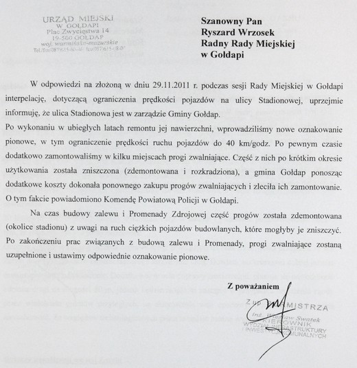 Jak wynika z odpowiedzi urzędu, część zamontowanych progów została rozkradziona, natomiast część zdemontowana na czas budowy zalewu i promenady zdrojowej. Te zdemontowane oraz nowe w miejsce skradzionych zostaną zamontowane po wykonaniu inwestycji. Nie ma jednak deklaracji dotyczącej remontu drogi.