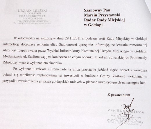 Mieszkańcy ul. Stadionowej chcą remontu swojej ulicy. Ze stosownym wnioskiem zwrócili się do Urzędu Miejskiego. O ustosunkowanie się urzędników miejskich do wniosku poprosił na sesji radny Marcin Przystawski.