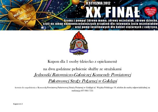12 stycznia szeregi Państwowej Straży Pożarnej zasilił na ponad dwie godziny 6-letni Oskar Stalewski z Gołdapi. W ten sposób Komenda Powiatowa Państwowej Straży Pożarnej w Gołdapi zrealizowała pierwszy z dwóch kuponów, które wystawiła na licytację w ramach XX finału Wielkiej Orkiestry Świątecznej Pomocy.