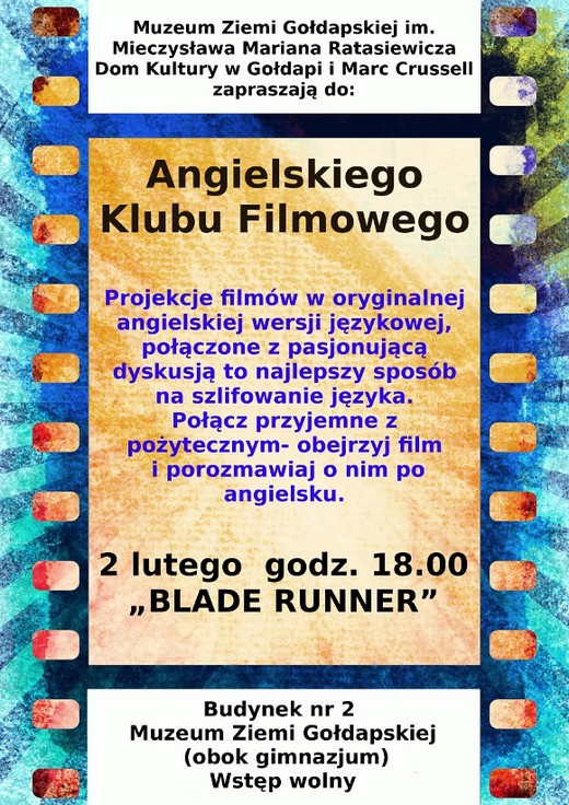 2 lutego o godz. 18.00 w Muzeum Ziemi Gołdapskiej odbędzie się kolejne spotkanie Angielskiego Klubu Filmowego. Tym razem filmem wyświetlanym w ramach Angielskiego Klubu Filmowego będzie „Łowca androidów". To amerykański produkcja z 1982 roku w reżyserii Ridleya Scotta, uznawana za klasyczny przykład kina science-fiction. Oryginalny tytuł to „Blade Runner", co w dosłownym tłumaczeniu znaczy „biegnący po ostrzu".