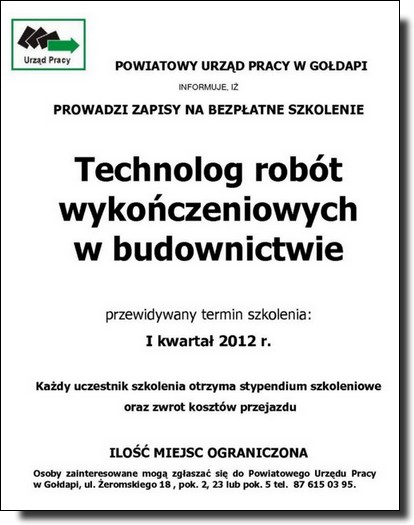 Jesteś bezrobotny, a chciałbyś zostać technologiem robót wykończeniowych w budownictwie? Jeśli tak to Powiatowy Urząd Pracy w Gołdapi ma propozycję. Rozpoczęły się zapisy na bezpłatne szkolenie w tym zakresie. Odbędzie się ono w pierwszym kwartale br., ale dokładna data nie jest jeszcze ustalona. Szczegóły na plakacie.
