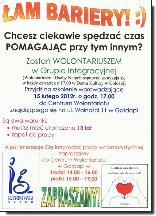 Chcesz ciekawie spędzać czas, jednocześnie pomagając innym? Jeśli tak zostań wolontariuszem w grupie integracyjnej. Szkolenie wprowadzające odbędzie się 15 lutego o godzinie 17.00 w Centrum Wolontariatu przy ul. Wolności 11 w Gołdapi. Szczegóły na plakacie.