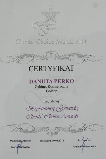 Nominacja do nagrody „Brylantowe Gwiazdy Clients' Choice Awards" uprawnia salony do umieszczenia informacji o sobie w katalogu „Najlepsze Salony Urody w Polsce 2012". Będzie on dystrybuowany m.in. w hotelach, przychodniach, restauracjach, urzędach i samolotach.