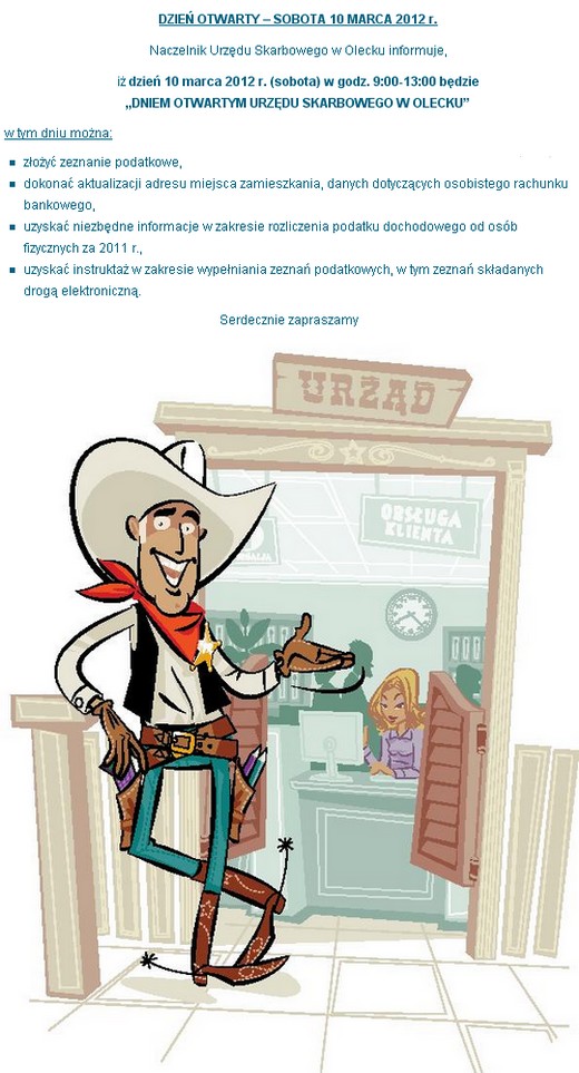 10 marca (sobota) będzie „Dniem Otwartym" Urzędu Skarbowego w Olecku. W godzinach 9.00-13.00 będzie można złożyć zeznanie podatkowe, uzyskać niezbędne informacje potrzebne do jego poprawnego wypełnienia, dokonać aktualizacji danych. Niestety, Punkt Obsługi Podatnika w Gołdapi będzie tego dnia nieczynny.