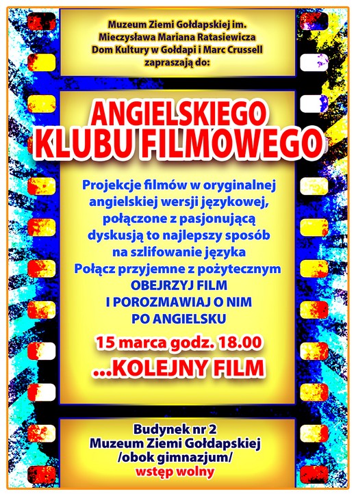 Muzeum Ziemi Gołdapskiej oraz Dom Kultury w Gołdapi zapraszają 15 marca na kolejne spotkanie Angielskiego Klubu Filmowego. Tym razem organizatorzy nie zdradzają jaki film zostanie wyświetlony w oryginalnej wersji językowej. Początek spotkania o godzinie 18.00. Wstęp jak zawsze bezpłatny.