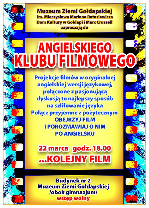 Muzeum Ziemi Gołdapskiej oraz Dom Kultury w Gołdapi zapraszają jutro (22/03) na kolejne spotkanie Angielskiego Klubu Filmowego. Tym razem także organizatorzy nie zdradzają jaki film zostanie wyświetlony w oryginalnej wersji językowej. Początek spotkania o godzinie 18.00. Wstęp jak zawsze bezpłatny.
