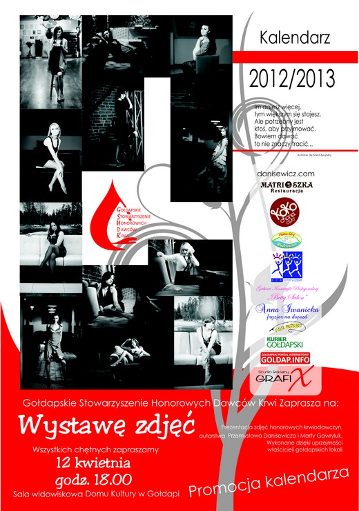 Gołdapskie Stowarzyszenie Honorowych Dawców Krwi oraz Dom Kultury w Gołdapi serdecznie zapraszają na wystawę zdjęć oraz promocję Kalendarza Krwiodawców 2012/2013. Jest on wyjątkowy, bo obejmuje okres od kwietnia 2012 do kwietnia 2013 roku. Kalendarz ukazuje dwanaście zwykłych-niezwykłych kobiet, które wspierają honorowe krwiodawstwo.