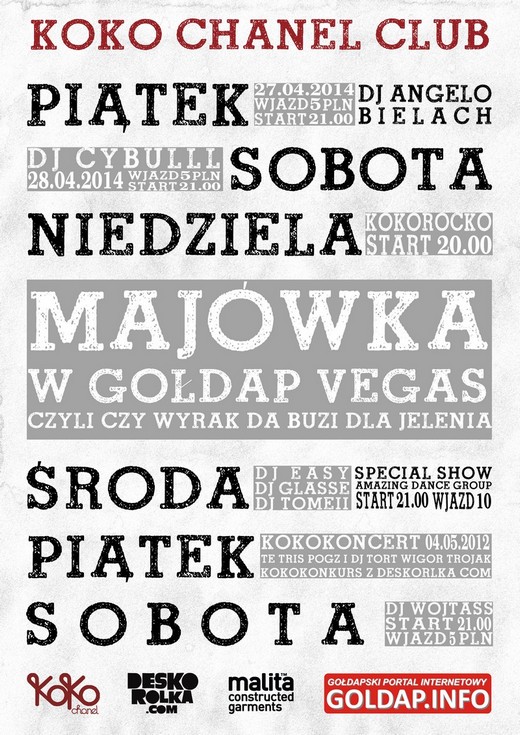 Koko Chanel Club przyspiesza zegary, majówka zaczyna się już jutro! Czekają na państwa znani i lubiani didżeje, a także koncerty i oczywiście konkursy. Szczegóły na plakacie.