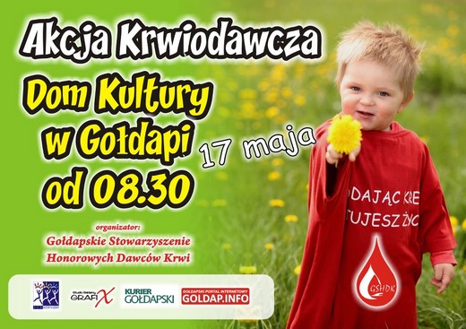 Zapraszamy państwa do udziału w comiesięcznej akcji krwiodawczej, organizowanej przez Gołdapskie Stowarzyszenie Honorowych Dawców Krwi. Odbędzie się ona 17 maja (czwartek) w sali widowiskowej Domu Kultury, początek o godzinie 8.30.