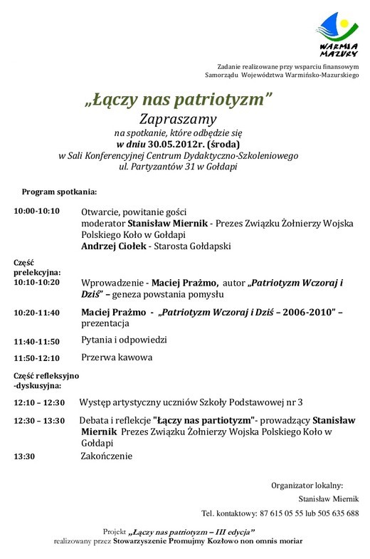 Stowarzyszenie Promujmy Kozłowo non omnis moriar wraz z partnerami, realizuje regionalny projekt „Łączy nas patriotyzm - III edycja". Projekt ten zakłada organizację powiatowych spotkań prelekcyjno-integracyjnych dla osób ze środowisk kombatanckich, z członkami organizacji pozarządowych, samorządowcami, młodzieżą, pracownikami szkół. Na spotkaniach przybliżymy państwu realizowany od wielu lat autorski Program „Patriotyzm Wczoraj i Dziś". Przygotowana prezentacja otrzymała wysoką ocenę przydatności edukacyjnej dla gimnazjów, szkół ponad gimnazjalnych i średnich, podczas pokazu dla pracowników Warmińsko-Mazurskiego Kuratorium Oświaty. Także patronat kuratorium.
