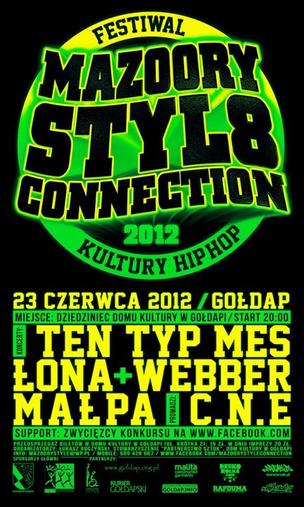 23 czerwca na dziedzińcu Domu Kultury w Gołdapi odbędzie się 8 edycja festiwalu Mazoory Style Connection. Na scenie wystąpią TenTypMes, Łona i Webber oraz Małpa. Bilety będą dostępne w biurze DK, w przedsprzedaży w cenie 15zł, w dniu imprezy 20zł. Organizatorami festiwalu są: Łukasz Buczyński, Stowarzyszenie „Partnerstwo Sztuk" oraz Dom Kultury. Więcej informacji na facebook.com/mazoorystyleconnection.