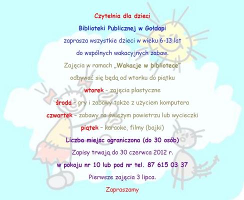 Czytelnia dla dzieci Biblioteki Publicznej w Gołdapi zaprasza dzieci w wieku 6-13 lat do wspólnych, wakacyjnych zabaw. Zajęcia w ramach „Wakacji z biblioteką" odbywać się będą od wtorku do piątku. Zapisy chętnych do 30 czerwca. Szczegóły na plakacie.