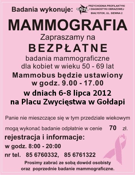 W lipcu po raz kolejny gołdapianki będą mogły wykonać badanie mammograficzne. Mammobus zawita do naszego miasta w dniach 6-8 lipca i będzie czekał na kobiety na pl. Zwycięstwa. Szczegółowe informacje są udzielane pod numerami telefonów 85-676-03-32 i 85-676-13-22.