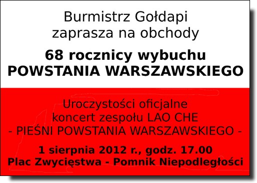 Burmistrz Gołdapi zaprasza na obchody 68 rocznicy Powstania Warszawskiego, które odbędą się pod Pomnikiem Niepodległości 1 sierpnia o godz. 17.00. W programie złożenie kwiatów oraz koncert zespołu Lao Che, który wykona m.in. pieśni z płyty pt. "Powstanie Warszawskie".