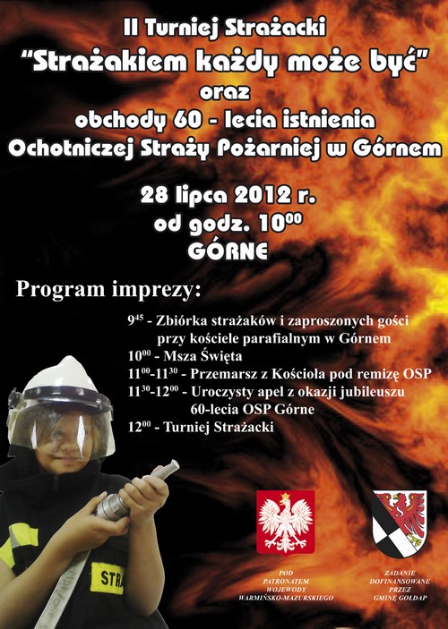 Ochotnicza Straż Pożarna w Górnem obchodzi w tym roku 60 urodziny. Uroczystości związane z tą rocznicą odbędą się 28 lipca. Tego samego dnia odbędzie się też II Turniej Strażacki „Strażakiem każdy może być". Szczegóły na plakacie.