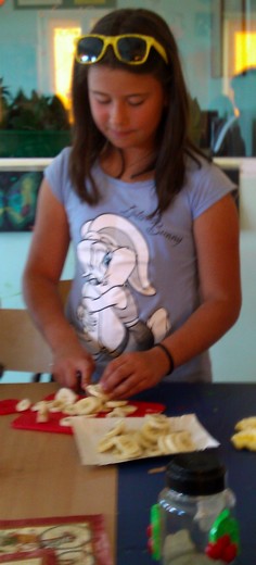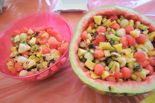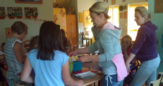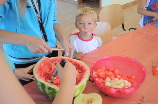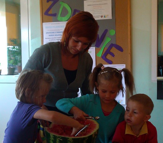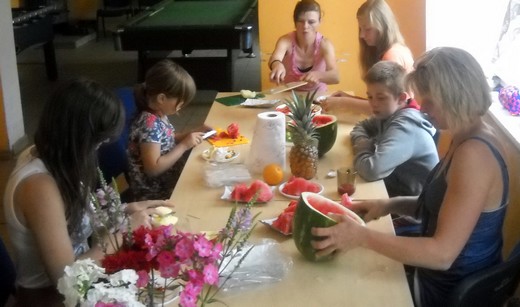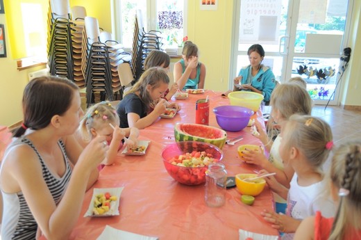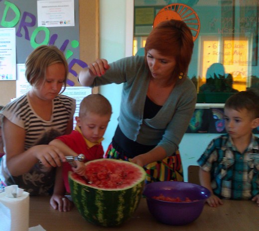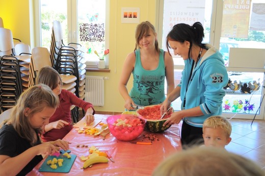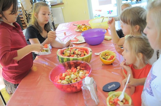 Nie wszyscy wpadli na pomysł, żeby z arbuza zrobić misę, a miąższ wydrążyć kulkownicą. Te pomysły oraz inne rady pomogły w przygotowaniu pysznej i słonecznej sałatki owocowej, która była pyszną zabawą dorosłych z dziećmi. Okazało się też, że są to wspaniałe chwile dla wszystkich niejadków oraz doskonały pomysł na wyrobienie zdrowych nawyków żywieniowych. Podsumowaniem wysiłków kulinarnych była wspólna degustacja sałatki, zachwyt nad ich smakami oraz rozmowy na temat przepisów kulinarnych i ich wymiana. Projekt jest realizowany dzięki dofinansowaniu ze środków Programu „Działaj Lokalnie VII".