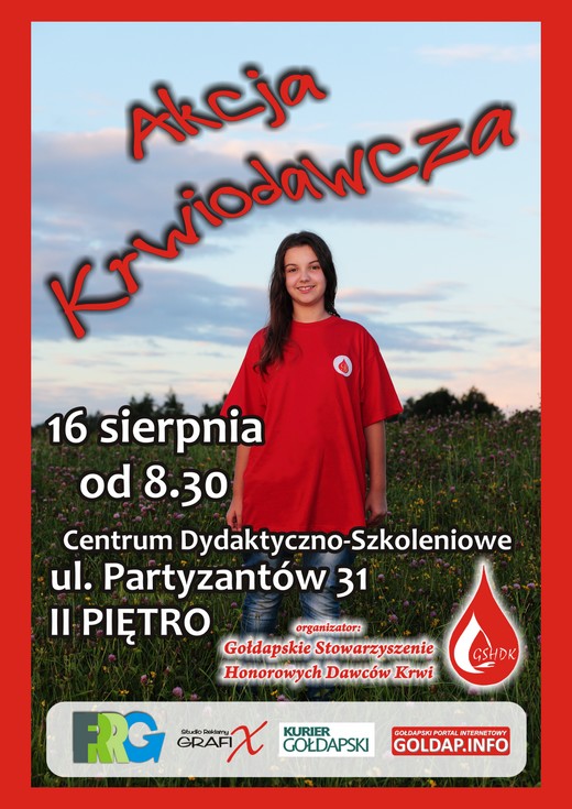Zapraszamy państwa do udziału w comiesięcznej akcji krwiodawczej, organizowanej prze Gołdapskie Stowarzyszenie Honorowych Dawców Krwi. Najbliższa odbędzie się w czwartek, 16 sierpnia w Centrum Dydaktyczno-Szkoleniowym przy ul. Partyzantów 31. Początek o godzinie 8.30.