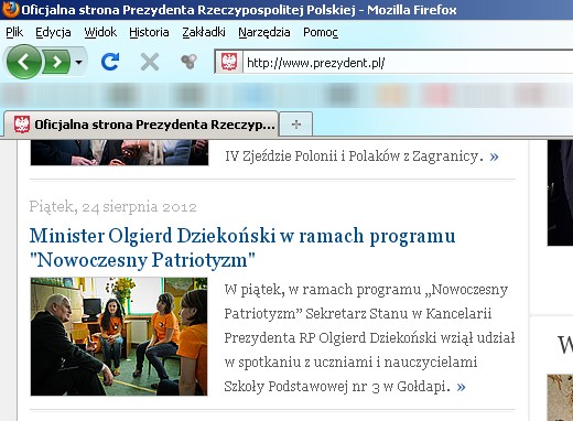 W ubiegłym tygodniu wolontariuszki z Fundacji Rozwoju Wolontariatu przeprowadziły w Szkole Podstawowej nr 3 w Gołdapi zajęcia w ramach projektu „Nowoczesny patriotyzm". Jak już informowaliśmy, w piątek gościem dzieci był Olgierd Dziekoński, minister z Kancelarii Prezydenta i jednocześnie honorowy wolontariusz. Warto zauwazyć, że wizyta ta została odnotowana też na głównej stronie internetowej prezydenta RP Bronisława Komorowskiego.