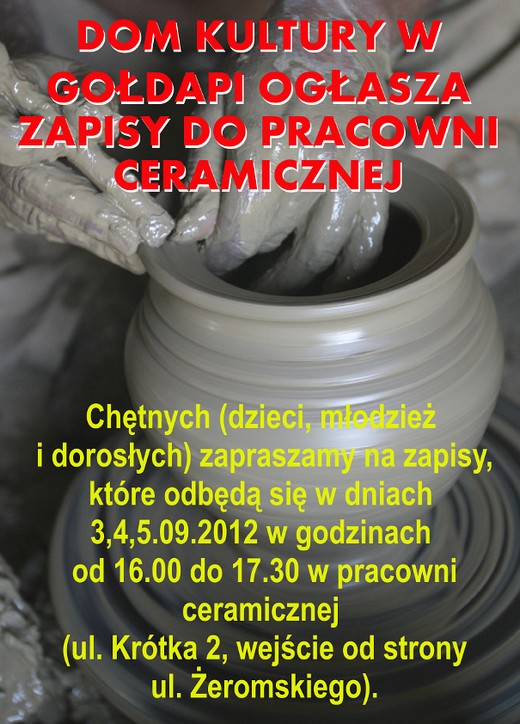 Dom Kultury w Gołdapi ogłasza zapisy chętnych dzieci, młodzieży i dorosłych do udziału w zajęciach w pracowni ceramicznej. Zainteresowani powinni zgłosić się w dniach 3-5 września miedzy godziną 16.00 a 17.30 do pracowni (ul. Krótka 2, wejście od strony ul. Żeromskiego).