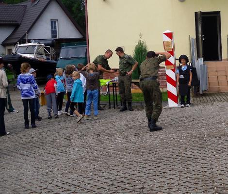 Z początkiem sierpnia, a dokładnie 7, dzieci (22 osoby), prócz trwających stałych zabaw i przygotowań do teatrzyku zagościły w Placówce Straży Granicznej w Gołdapi. Funkcjonariusze broniący naszych granic wspaniale przyjęli dzieci. Na stoliku leżały przygotowane: kamizelka kuloodporna, hełm, kajdanki, kamizelka odblaskowa, a także samochody i motorówka, jakimi straż graniczna porusza się podczas służby. Na wstępie dzieci posłuchały czym zajmuje się straż graniczna, jaka jest ich praca. Następnym elementem wycieczki było zwiedzanie samochodów i oczywiście bardzo ważny punk spotkania gdzie dzieci mogły zostawić swoje odciski palców i dowiedziały się, dlaczego są one brane (oczywiście poszukiwani listem gończym). Najmłodszych najbardziej cieszył, ale zarazem zadziwił fakt pogłaskania psa, który posłusznie warował obok swego przewodnika. Jak się dowiedzieliśmy nikt tak normalnie nawet nie zbliżyłby się do psa w innych okolicznościach. Wycieczka jak zawsze bardzo udana i niecodzienna, ponieważ wstęp na teren straży granicznej jest wzbroniony.