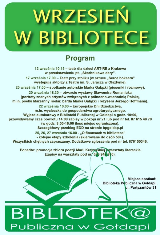 Wiele atrakcji dla gołdapian zaplanowała na wrzesień Biblioteka Publiczna w Gołdapi. Będą m.in. spotkanie autorskie z Markiem Gałązką, warsztaty literackie, teatr przy stoliku i obchody Europejskich Dni Dziedzictwa. Szczegóły na plakacie.