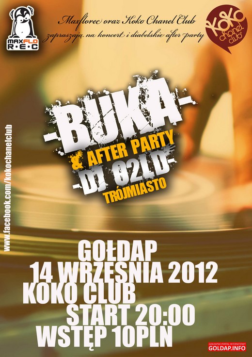 Już dziś do Gołdapi zawita jeden z najlepszych wirtuozów słowa młodego pokolenia ostatnich lat. Buka, bo o nim właśnie mowa, pochodzi z Trójmiasta. Początki jego twórczości sięgają 2007 roku, kiedy to powstał zespół "SumaStyli", do którego należy po dziś dzień. W roku 2011 nakładem wytwórni MaxFloRec, należącej do Rahima (Paktofonika, Pokahontaz) ukazała się jego płyta "Pokój 003", na której pojawiły się takie utwory jak "Wraca Monster", "Pierwsza Miłość", "37" czy "Achtung". Płyta jest hybrydą wielu styli, począwszy od humorystycznych nawiązań, przez bragge, story telling, kończąc na psychorapie, ale również konkretnym imprezowym uderzeniu. Takiego artysty bez wątpienia jeszcze w Gołdapi nie gościliśmy. Pierwszy i jedyny koncert Buki odbędzie u znanego imprezowego monopolisty czyli w klubie KoKo.