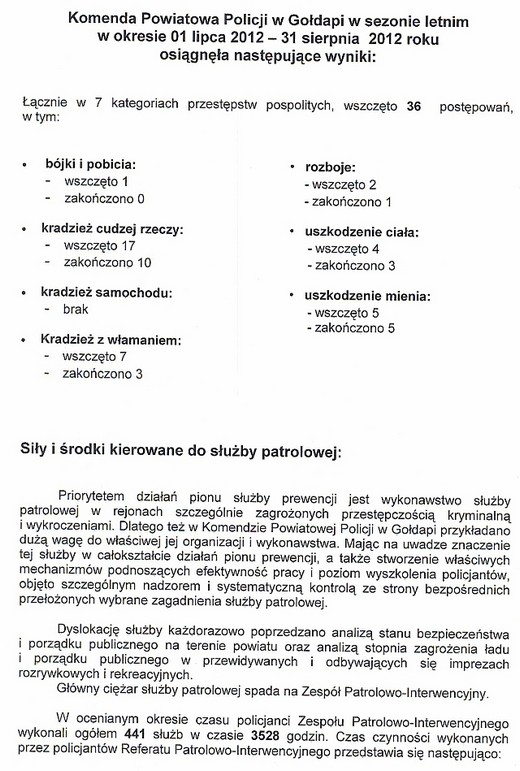 W okresie od 1 lipca do 31 sierpnia w 7 kategoriach przestępstw pospolitych (bójki i pobicia, rozboje, kradzieże cudzej rzeczy, uszkodzenie ciała, kradzieże samochodów, uszkodzenie mienia, kradzieże z włamaniem) policjanci wszczęli 36 postępowań.
