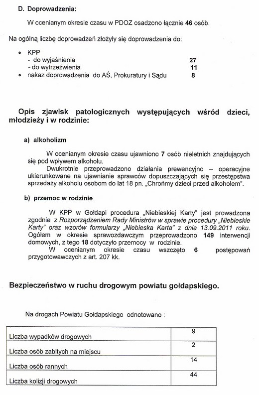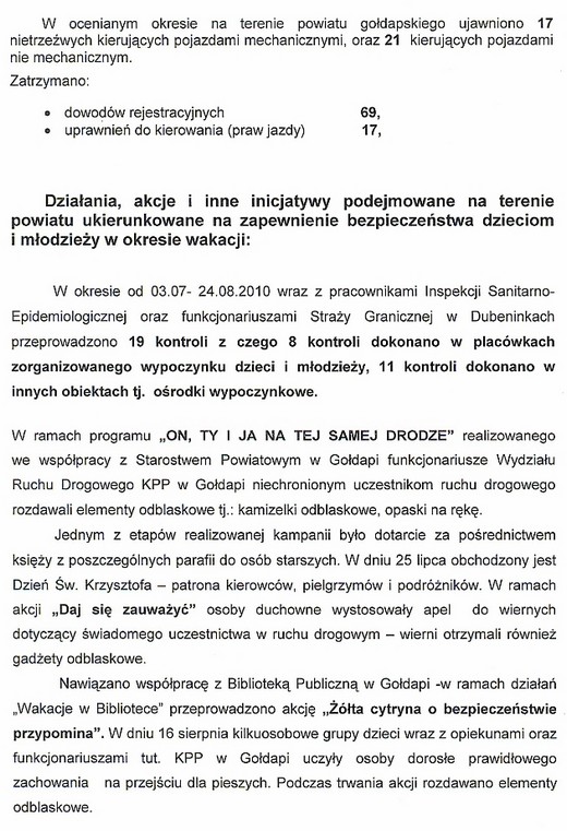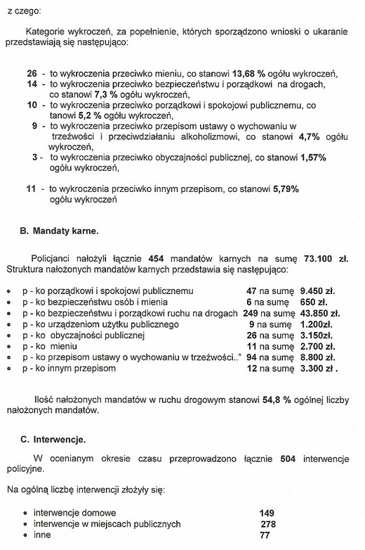 W sezonie letnim przeprowadzonych zostało 190 postępowań w sprawach o wykroczenia, z czego 73 zakończyły się wnioskami do sądu o ukaranie. Najwięcej wykroczeń było przeciwko mieniu. Liczba mandatów karnych wystawionych w okresie wakacji wynosi 454, z czego ponad 50% dotyczy spraw związanych bezpieczeństwem i porządkiem w ruchu drogowym. Jeżeli chodzi o interwencje, w opisywanym okresie było ich 504, najwięcej w miejscach publicznych, bo aż 278. Podczas 149 interwencji domowych do policyjnego pomieszczenia dla osób zatrzymanych trafiło 46 osób. Sporządzono 18 niebieskich kart, wszczęto 6 postępowań przygotowawczych za znęcanie się nad rodziną. Ponadto w wakacje ujawniono 7 nieletnich osób znajdujących się pod wpływem alkoholu.