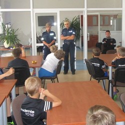 GOŁDAP. Policjantki z gołdapskiej komendy odwiedziły dzieci, które uczestniczą w sportowym obozie piłkarskim. Opowiadały o bezpiecznych formach wypoczynku, wręczyły też odblaski zakupione w ramach projektu „On, ty i ja na tej samej drodze”.
