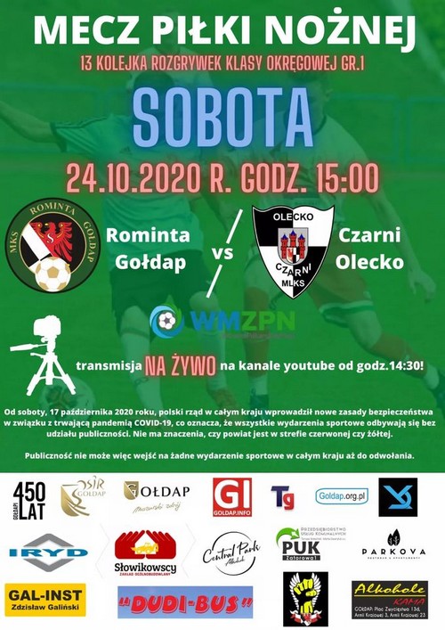 Kolejne spotkanie gołdapianie rozegrają 24 października na własnym stadionie z Czarnymi Olecko. Mecz odbędzie się bez udziału publiczności.