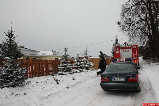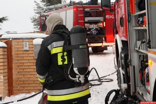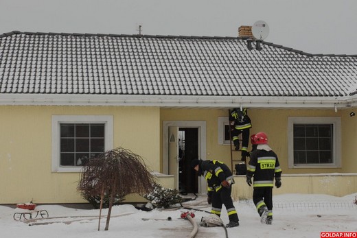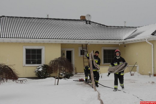 Około godziny 14 dyżurny Państwowej Straży Pożarnej został powiadomiony o pożarze w jednym z domów jednorodzinnych przy ul. Polnej w Gołdapi. Po przybyciu na miejsce zdarzenia strażacy w aparatach powietrznych weszli na zadymione poddasze budynku. Okazało się, że palą się belki stropowe. Aby dotrzeć do źródła ognia trzeba było wyciąć część konstrukcji budynku. Przyczyna pożaru nie jest znana. Niewykluczone, że ogień pojawił się od komina. W akcji gaśniczej brało udział 10 strażaków z PSP w Gołdapi.