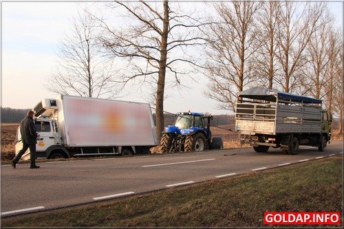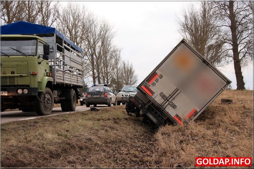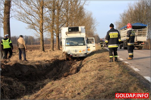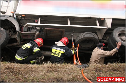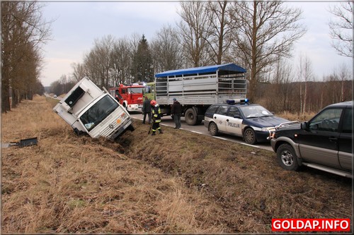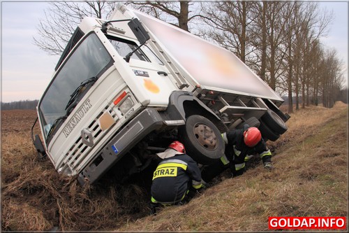 Około godziny 9:40 kierowca dostawczego samochodu jadąc z Gołdapi w kierunku Kowal Oleckich przed Pogorzelem zasnął za kierownicą i zjechał do przydrożnego rowu. Po kilkunastu minutach na miejscu pojawili się powiadomieni gołdapscy strażacy i rozpoczęli próby postawienia pojazdu na kołach. Udało się to dosyć szybko. Strażacy mieli okazję wykorzystać tym celu w warunkach „bojowych" nowoczesny, kolumnowy rozpieracz hydrauliczny. Pozostało jeszcze wyciągnąć samochód na równy teren. Wyglądało, że utrudnienia na drodze krajowej nr 65, na której odbywał się ruch wahadłowy, potrwają najwyżej kilkanaście minut. Niestety, właściciel samochodu nie zgodził się na wezwanie dźwigu i chciał wyciągnąć samochód we własnym zakresie. Rozpoczęły się próby z użyciem między innymi ciągnika i drugiego samochodu ciężarowego. Niestety, zakończyły się one niepowodzeniem. Wezwany po trzech godzinach właściciel dźwigu chciał podjąć się wyciągnięcia ciężarówki na drogę, nie był jednak w stanie zagwarantować, że paka samochodu podczas tej operacji nie zostanie uszkodzona. To nie spodobało sie właścicielowi ciężarówki i odmówił skorzystania z oferty. Taka „zabawa" zdenerwowała obecnych na miejscu policjantów. Dali właścicielowi 15 minut na usuniecie auta z pasa drogowego. W przeciwnym razie powiadomiona miała być Dyrekcja Dróg Krajowych i Autostrad, która to przy użyciu własnego sprzętu usunęłaby auto na koszt przedsiębiorcy. Warto zaznaczyć, że koszty takiej operacji są już znaczne. Postawione ultimatum poskutkowało. Właścicielowi ciężarówki w ciągu kilkunastu minut udało się sprowadzić ciężki ciągnik, który bez problemu ściągnął ciężarówkę na boczną drogę.