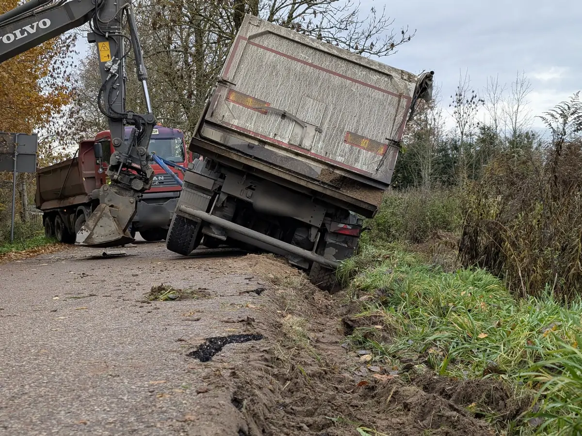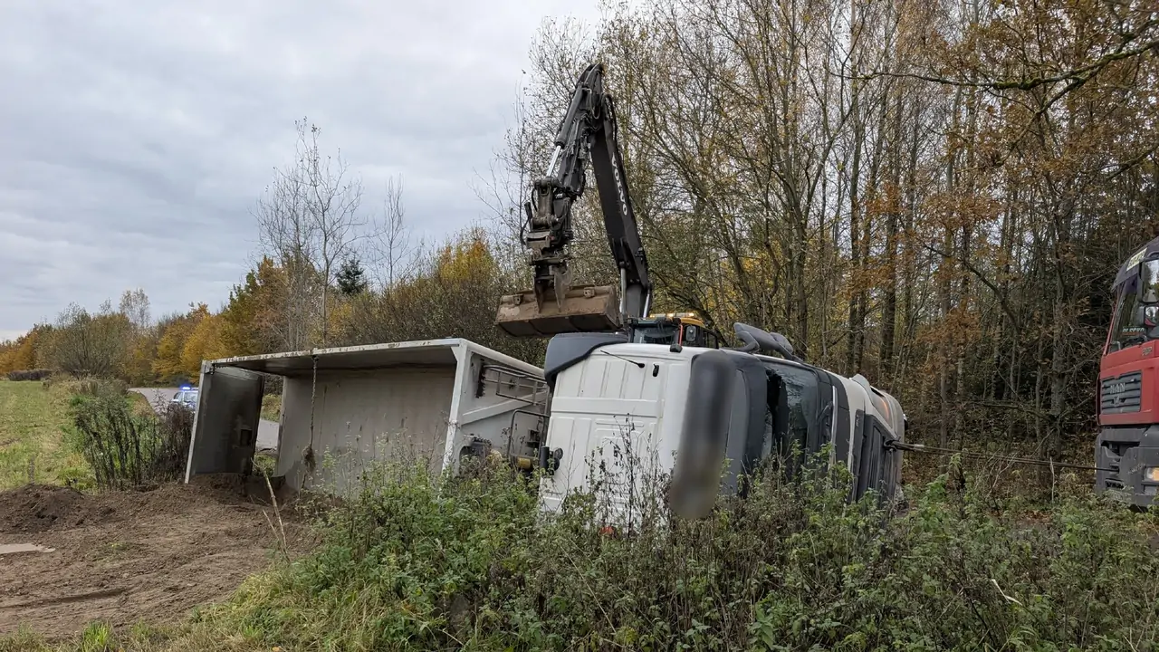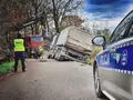 Pobocze drogi nie wytrzymało ciężaru ciągnika siodłowego i naczepy. Zestaw się przewrócił.