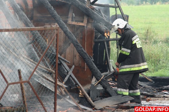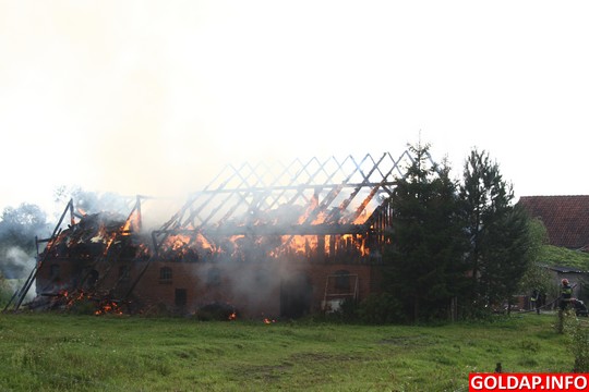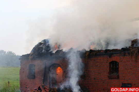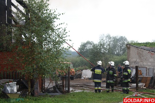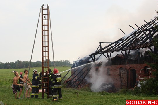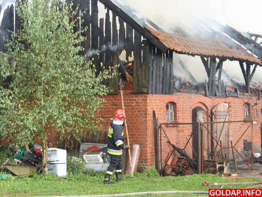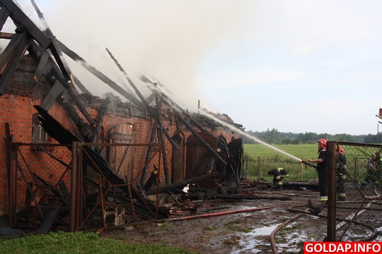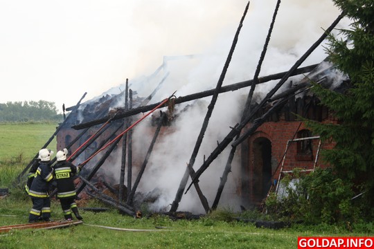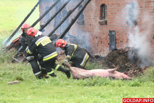 Krótka, ale silna burza, jaka przeszła nad Gołdapią po południu, zostawiła swój ślad w postaci pożaru. Około godziny 16.30 od uderzenia pioruna zapalił się budynek gospodarczy w Pięknych Łąkach. Wezwani na miejsce strażacy rozpoczęli akcję od przygaszenia ognia i wyciągnięcia z budynku zwierząt. Niestety, kilku świń oraz kur nie udało sie uratować. Spaliło się też siano, które było na poddaszu budynku.