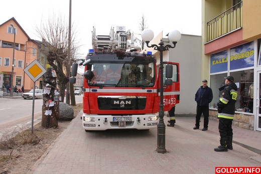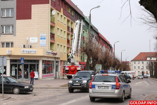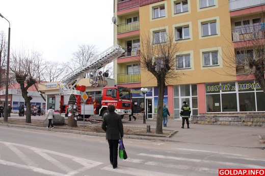Przed południem dyżurny straży pożarnej otrzymał informację o zadymieniu w jednym z mieszkań przy Pl. Zwycięstwa. Strażacy, którzy przybyli na miejsce zdarzenia, zapukali do jego drzwi. Niestety, nikt nie otwierał. W związku z tym użyto podnośnika, by zajrzeć przez okno i sprawdzić, co się dzieje w mieszkaniu i jeśli wymagałaby tego sytuacja, wyważyć drzwi lub okno.