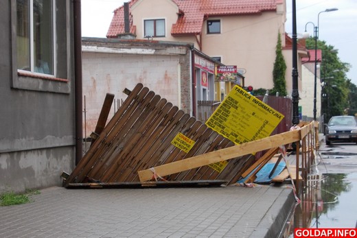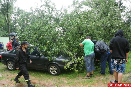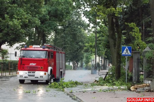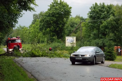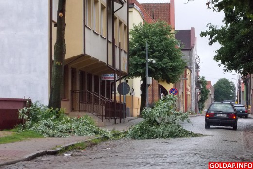 Kilkanaście minut przed godziną 11 na Jeziorze Gołdap od podmuchu wiatru wywróciła się żaglówka. Po otrzymaniu informacji o zdarzeniu przez dyżurnego policji natychmiast na miejsce zostały skierowane służby ratunkowe. Strażacy wyciągnęli z wody mężczyznę, który pływał jachtem sam. Jego życiu nie zagraża niebezpieczeństwo. W Kiekskiejmach (gm. Dubeninki) wichura zerwała zaś dach jednego z domów. Po południu podczas festynu w Żytkiejmach na samochód przewróciła się jabłonka, która pień i korzenie najprawdopodobniej zostały naruszone w wyniku wichury. Na szczęście dla właściciela samochód, poza kilkoma drobnymi ryskami nie został uszkodzony.