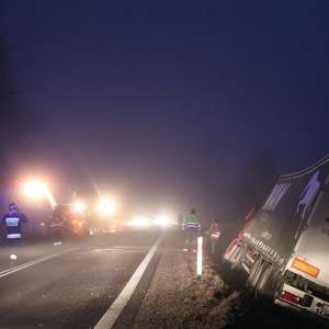 Pobocze drogi nie wytrzymało ciężaru ciągnika siodłowego i naczepy. Zestaw się przewrócił.