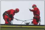 Dziś na terenie Szkoły Podstawowej nr 3 w Gołdapi przeprowadzono ćwiczenia doskonalące dla gołdapskich strażaków, należących do Specjalnej Grupy Ratownictwa Wysokościowego „Gołdap". Grupa 8 ratowników wysokościowych otrzymała zadanie dotarcia, zabezpieczenia medycznego i ewakuacji poszkodowanego z dachu budynku.