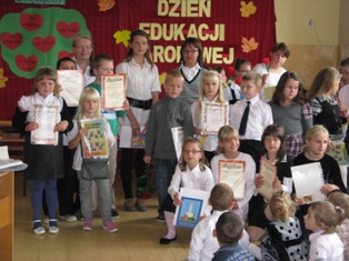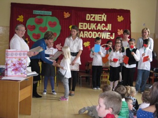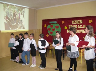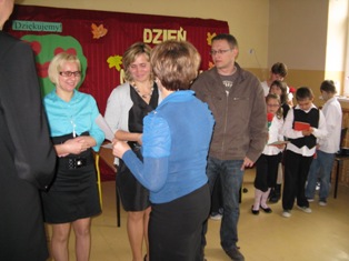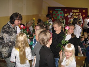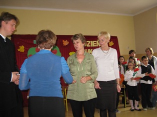 Uczniowie zaprezentowali program artystyczny, podczas którego zabrali wszystkich na multimedialną wycieczkę do naszej szkoły. Następnie recytując i śpiewając złożyli życzenia nauczycielom i pracownikom. Podczas apelu Helena Mackiewicz wręczyła dyplomy i nagrody za udział z konkursie „Na najpiękniejszy różaniec". Na zakończenie uroczystości uczniowie wręczyli własnoręcznie wykonane upominki. Kwiaty i kartki powstały podczas kółek plastycznych prowadzonych przez K. Celińską i K. Solarczyk. Nad całością czuwała Katarzyna Solarczyk, opiekun SU.