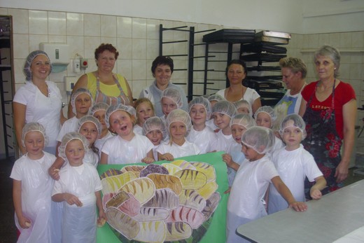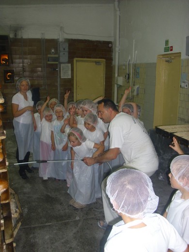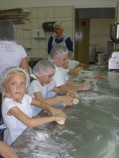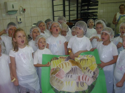 16 października dzieci z oddziału 0B wraz z wychowawczynią Sylwią Kurpios-Sawicką udały się na zajęcia do piekarni. Wycieczkę udało się zorganizować dzięki uprzejmości państwa Agnieszki i Marcina Talipskich. Obserwację pracy piekarza dzieci rozpoczęły od poznania maszyn używanych w piekarni. Następnie przyglądały się ogromnemu piecowi. Wielkie łopaty do wkładania i wyjmowania chleba z pieca wywarły na dzieciach wrażenie. Przedszkolaki obserwowały powstawanie ciasta chlebowego, jego dzielenie na porcje oraz formowanie go w owalne kształty. Wszystkie dzieci wiedzą, że uformowane ciasto chlebowe musi „odpocząć" od wygniatania w swoich „kołyskach". Każdy maluch po wizycie w piekarni wie, że kiedy wypoczęte ciasto „nabierze siły" stając się większe, trafia do pieca. Szybkie tempo pracy piekarzy przy piecu wprawiło przedszkolaków w osłupienie. Dowiedziały się one, że upieczone pieczywo należy polewać zimną wodą w celu nabłyszczenia bochenków i zmycia resztek mąki. Największą frajdę sprawiło dzieciom formowanie bułek z ciasta, które za niedługą chwilę zostały upieczone. Degustując upieczone bułeczki, dzieci zachwycały się ich smakiem. Przedszkolaki podziękowały za wspaniałą przygodę poznawczą paniom i panom piekarzom wierszem, wręczając jednocześnie zespołową pracę plastyczną.