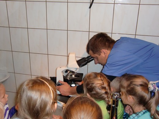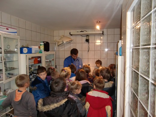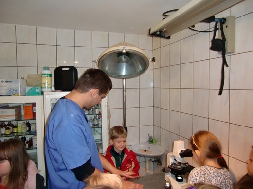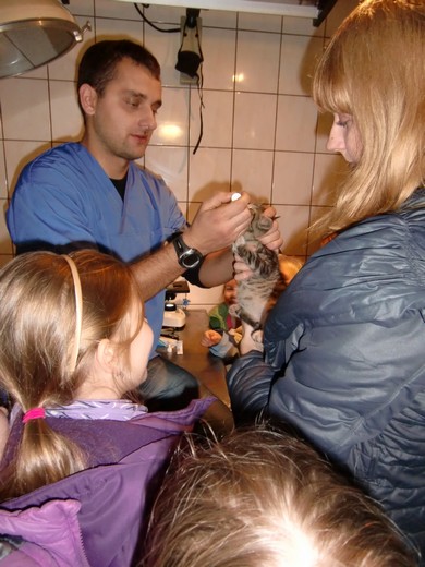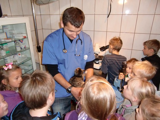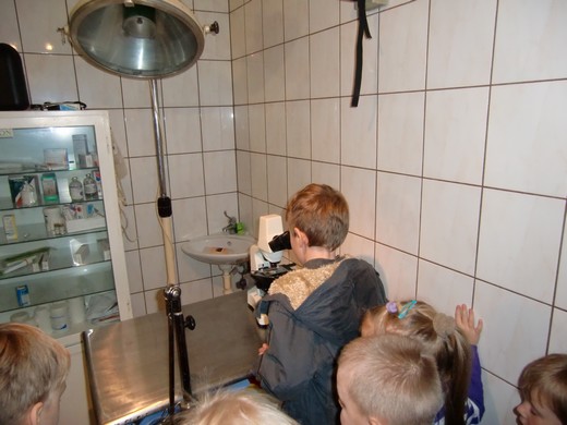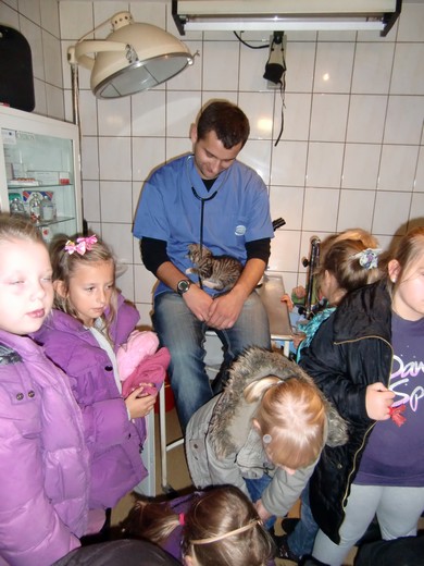 W środę, 7 listopada uczniowie odwiedzili gabinet weterynaryjny. W czasie wizyty dowiedzieli się, na czym polega praca weterynarza, jak przebiega wizyta czworonoga u lekarza oraz w jaki sposób należy dbać o swojego pupila. Dzieci miały możliwość posłuchać serduszka kotka oraz zobaczyć pod mikroskopem różne preparaty. Pod koniec wizyty do gabinetu weterynaryjnego zgłosił się z właścicielką pacjent - pies spaniel. Ta nieoczekiwana wizyta sprawiła, że dzieci miały możliwość osobiście obserwować pracę weterynarza. Na zakończenie wizyty dzieci podziękowały lek. wet. Damianowi Ruszewskiemu za ciekawą lekcję.