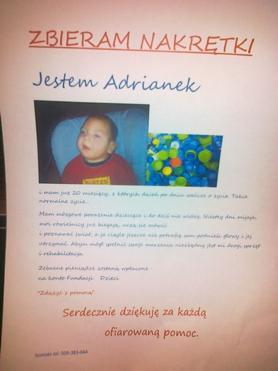 W Szkole Podstawowej nr 3 ruszyła kolejna zbiórka nakrętek. Tym razem uczniowie zbierają je dla Adriana , który cierpi na mózgowe porażenie dziecięce. Chłopczyk nie widzi i nie chodzi. Różnego typu nakrętki, zakrętki, kapsle, korki, wieczka i pokrywki - obojętnie jaki mają kształt i kolor - uczniowie mogą przynosić do swoich klas. Pieniądze z przetworzonych nakrętek przeznaczone zostaną na sprzęt i rehabilitację chłopca. 7 listopada mama chłopca odebrała od nas pierwsze nakrętki. Dziękuję uczniom i wychowawcom zaangażowanych w pomoc dla Adriana.