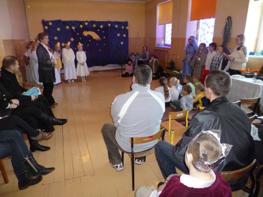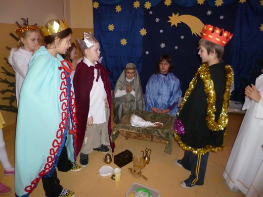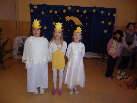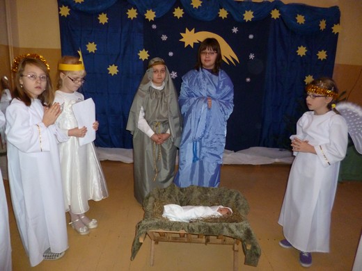 Bardzo uroczysty i podniosły nastrój panował dziś w Szkole Podstawowej w Jabłońskich. Od wielu lat w naszej placówce istnieje tradycja spędzania tego dnia w sposób wyjątkowy. Dyrektor Aleksandra Retel zaprosiła ks. Czesława Króla, proboszcza parafii św. Leona i Bonifacego w Gołdapi, wszystkich nauczycieli, uczniów i ich rodziców. Ciepłymi i serdecznymi słowami powitała przybyłych gości. Uczniowie klas II-VI pod przewodnictwem Heleny Mackiewicz i Edyty Izbickiej przedstawiły inscenizację „Betlejemska noc". Gra małych wspaniałych aktorów zachwyciła widzów, a przesłanie płynące z pięknie recytowanych tekstów i śpiewanych kolęd poruszyły serca obecnych na uroczystości.