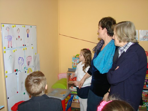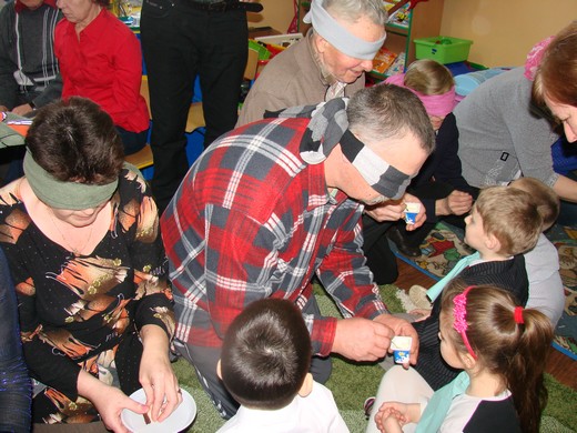 Po chwili wytchnienia wykazać musieli się ci, dla których zorganizowane było spotkanie. Babcie i dziadkowie wzięli udział w przygotowanych specjalnie dla nich konkurencjach. Odszukiwali swoje podobizny wśród portretów narysowanych przez dzieci, wykonywali wnukom ekologiczne stroje z papieru toaletowego oraz z zawiązanymi oczami karmili swoje pociechy.