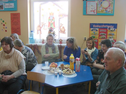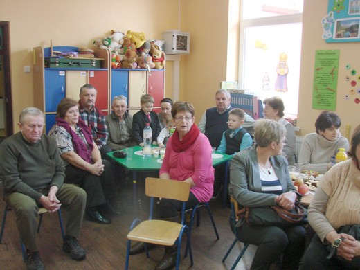 Gdy emocje już nieco opadły dzieci chwyciły za przygotowane wcześniej laurki i upominki, po czym wręczyły je swoim babciom i dziadkom. Goście częstowali się słodkościami, pili ciepłą kawę i herbatę, a wnuczęta nie odstępowały ich na krok.